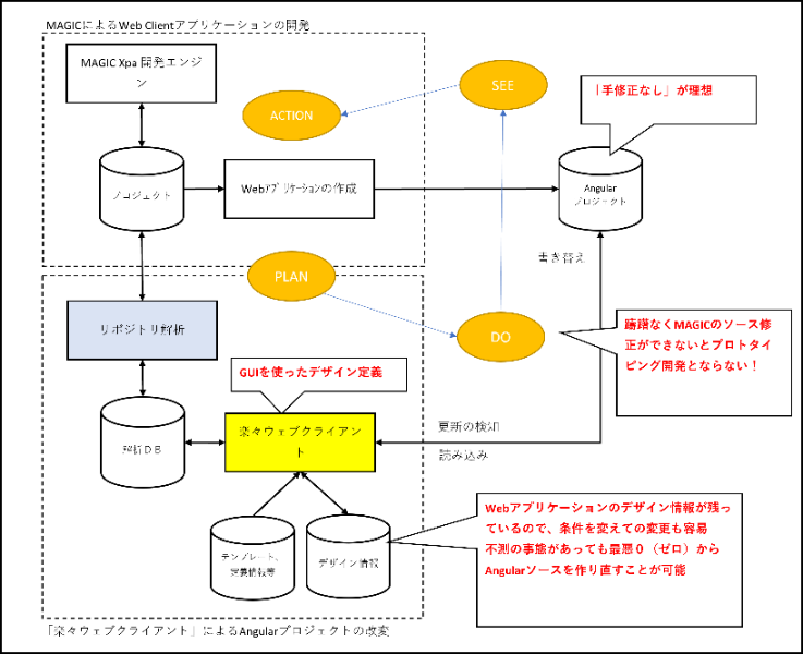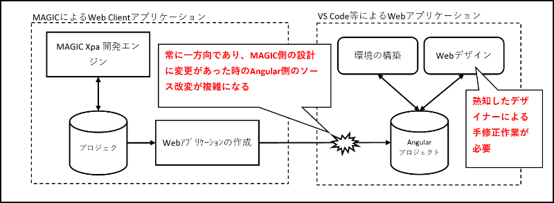 この結果、MAGIC側のロジックの完成度を高めたのちにAngularでの開発に移行するなど、設計変更を極力避ける必要に迫られてしまうことになります。