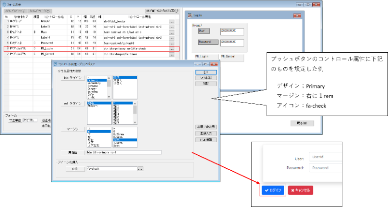 プッシュボタン/エディット/ラベル/ラジオボタン/コンボボックス等のコントロール種別毎にBootstrapの指定可能なクラス属性を定義することが可能です。