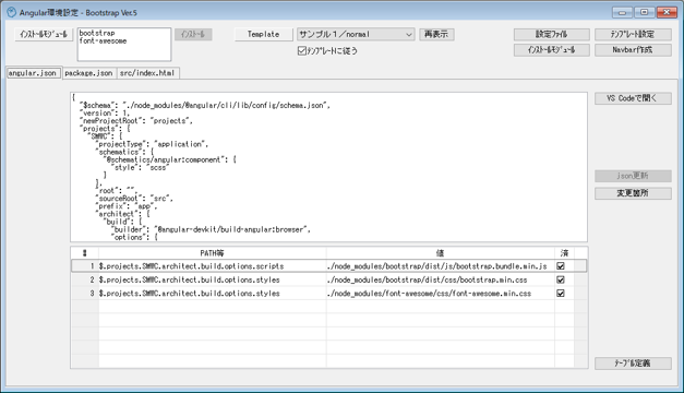npmモジュールのインストール、angular.jsonの設定、src/index.htmlの設定、src/styles.cssの設定等を自動化します。